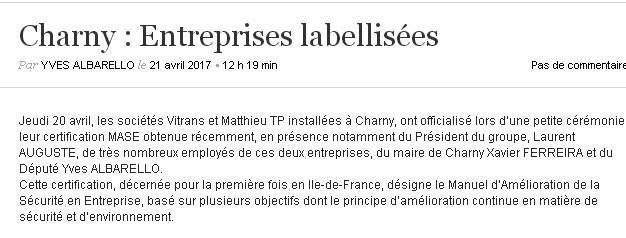 Ironie du sort il y a quelques jours le député maire Yves Albarello de Claye-Souilly et le maire de Charny Xavier Ferreira ont assisté à une petite cérémonie pour officialiser une certification de la Sté Vitrans portant, semble t-il, sur le principe d’amélioration continue en matière de sécurité et d’environnement.